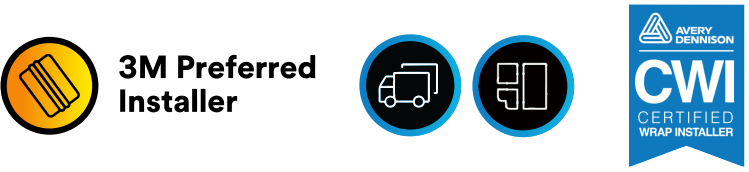 3m Logo indicating certified wrap installer with icons of a truck and a roll of film, and a blue banner with the Avery Dennison logo.